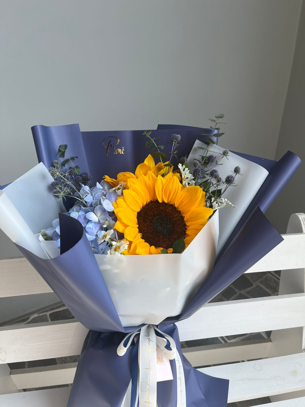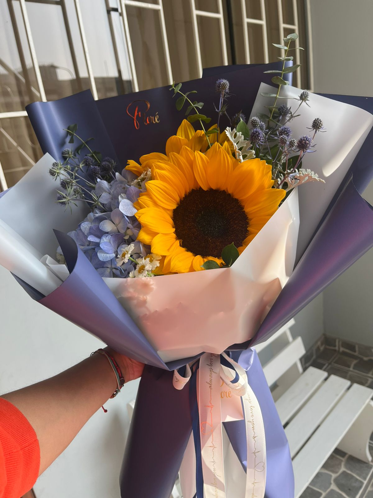 Un ramo que combina la fuerza de 2 girasoles con la delicadeza de las hortensias azules y los toques silvestres en tonos violetas. Su contraste de colores refleja la armonía entre el sol y el cielo, creando un detalle único, elegante y lleno de vida.