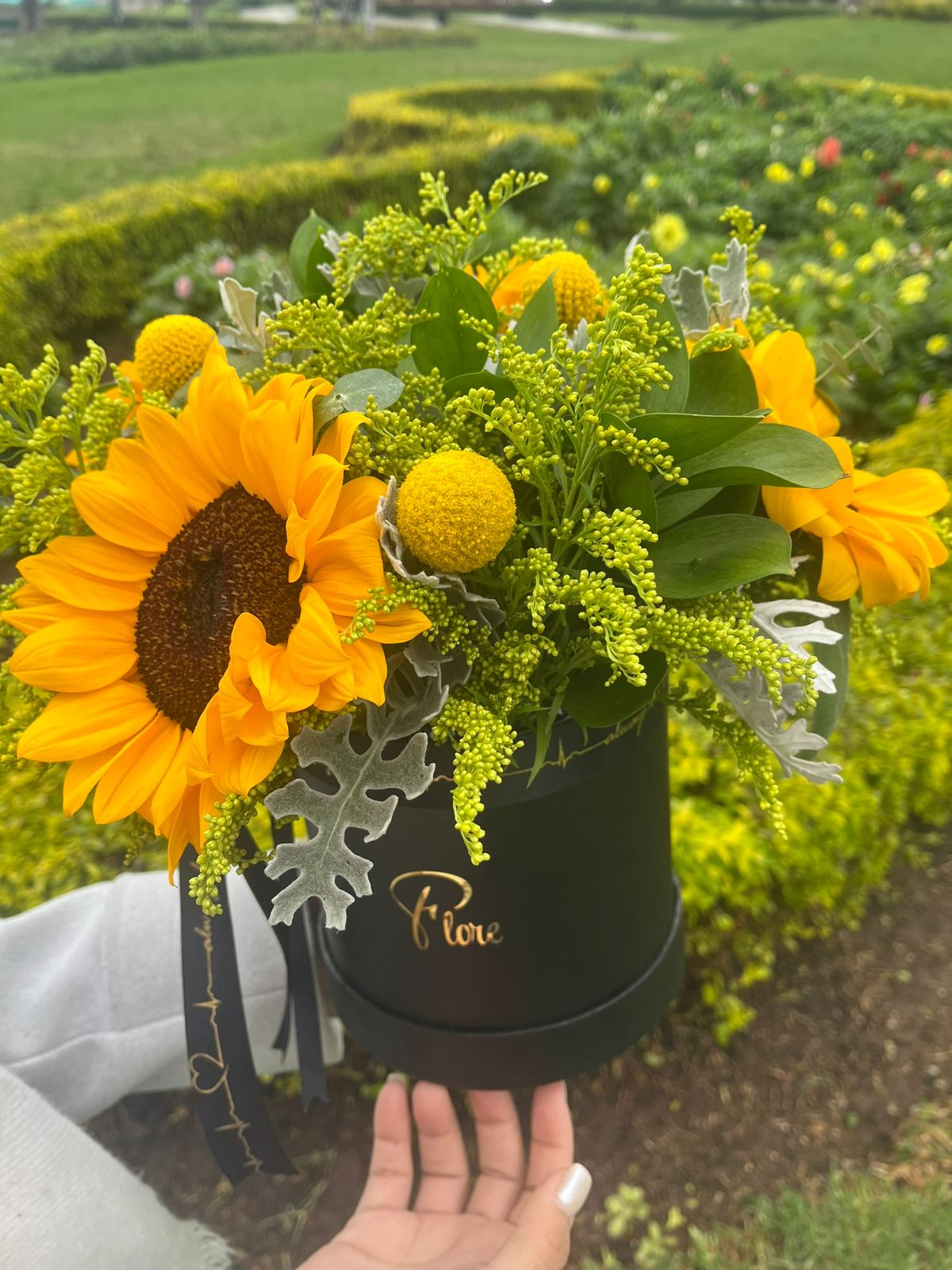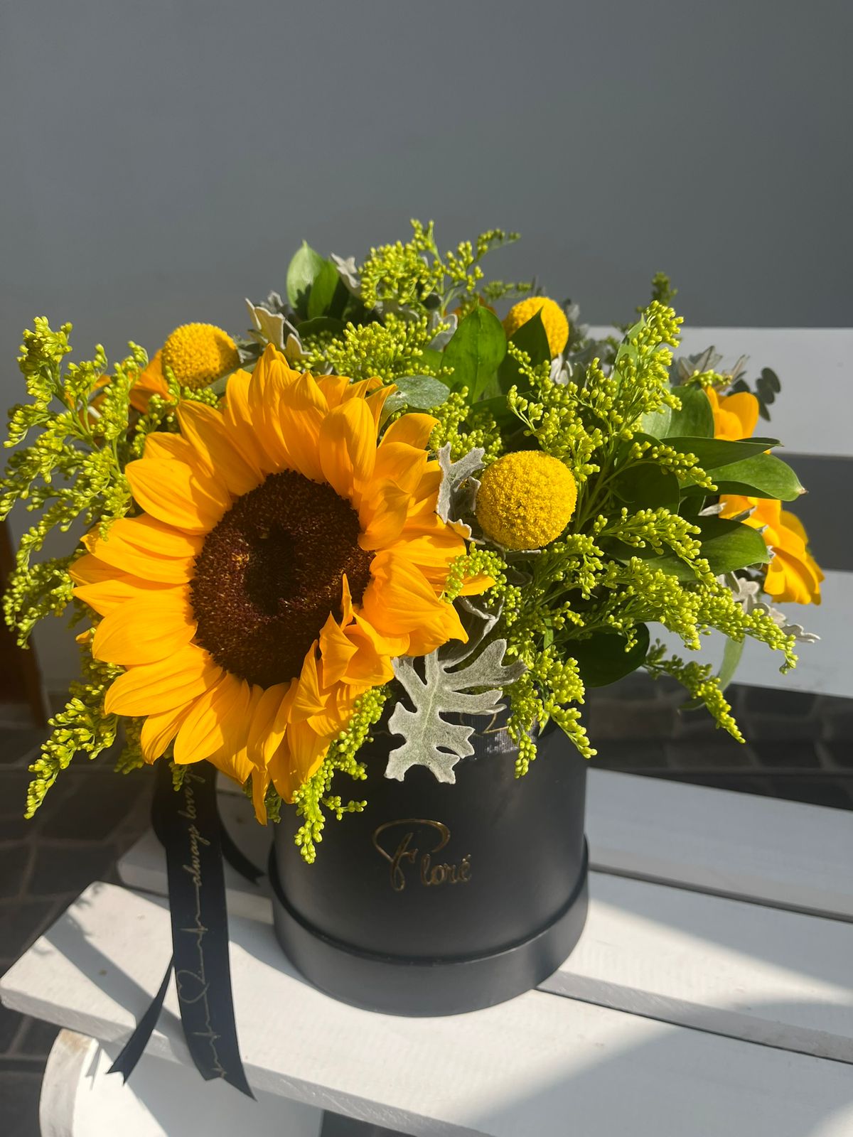 Un elegante box en tono negro que resalta la intensidad y belleza de los 4 girasoles. Acompañados de craspedias y follajes verdes, este arreglo transmite fuerza, alegría y vitalidad. Su contraste de colores lo convierte en un detalle moderno y sofisticado, ideal para sorprender con luz y energía.