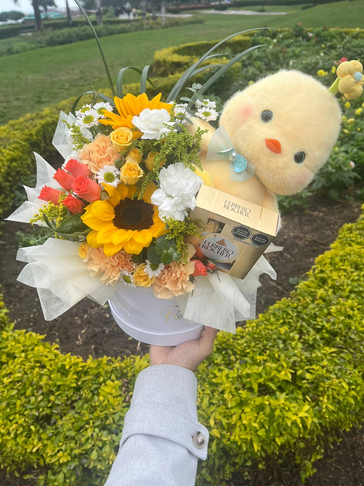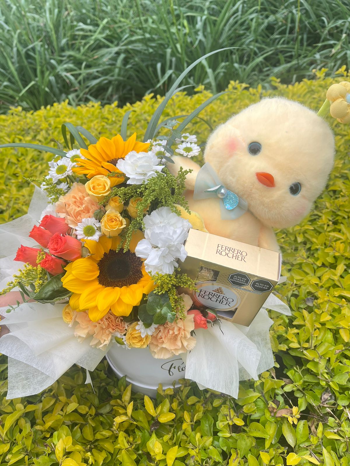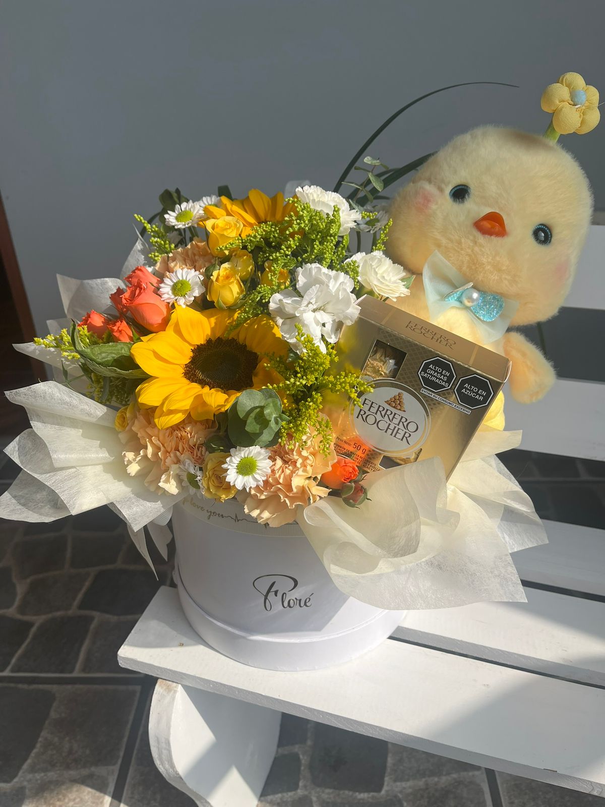 Un box lleno de ternura y color que combina la alegría de 2 girasoles con la delicadeza de mini rosas en tonos anaranjados, clavelones importados y margaritas en tonos cálidos y frescos. Acompañado de un tierno peluche y chocolates Ferrero Rocher, este detalle es la fusión perfecta entre dulzura, amor y cariño.