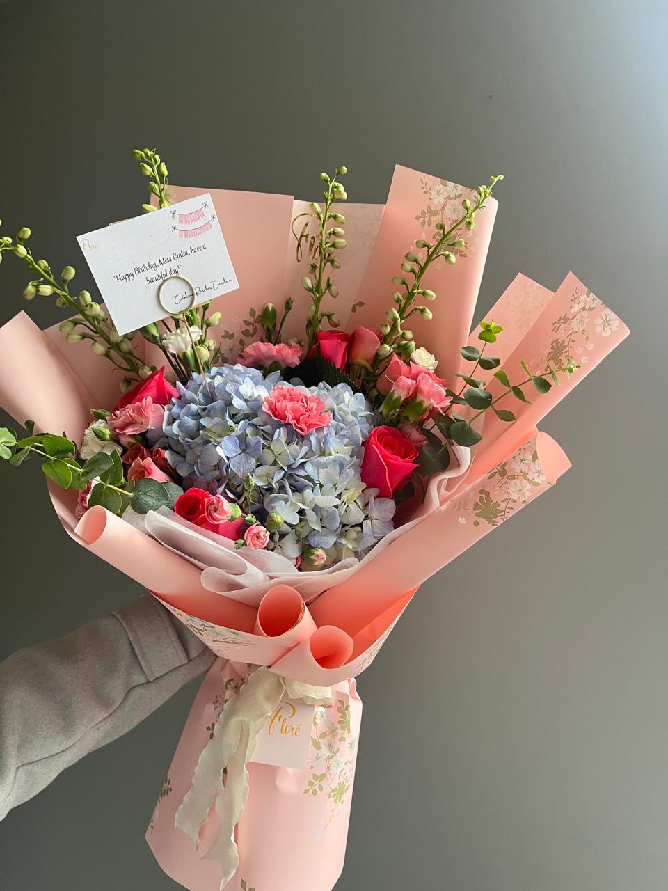 Regala un momento inolvidable con este ramo que combina la frescura de las hortensias azules, la pasión de las rosas rosadas y la ternura de los tonos rosados. Perfecto para cumpleaños, aniversarios o simplemente para decir “me importas”.