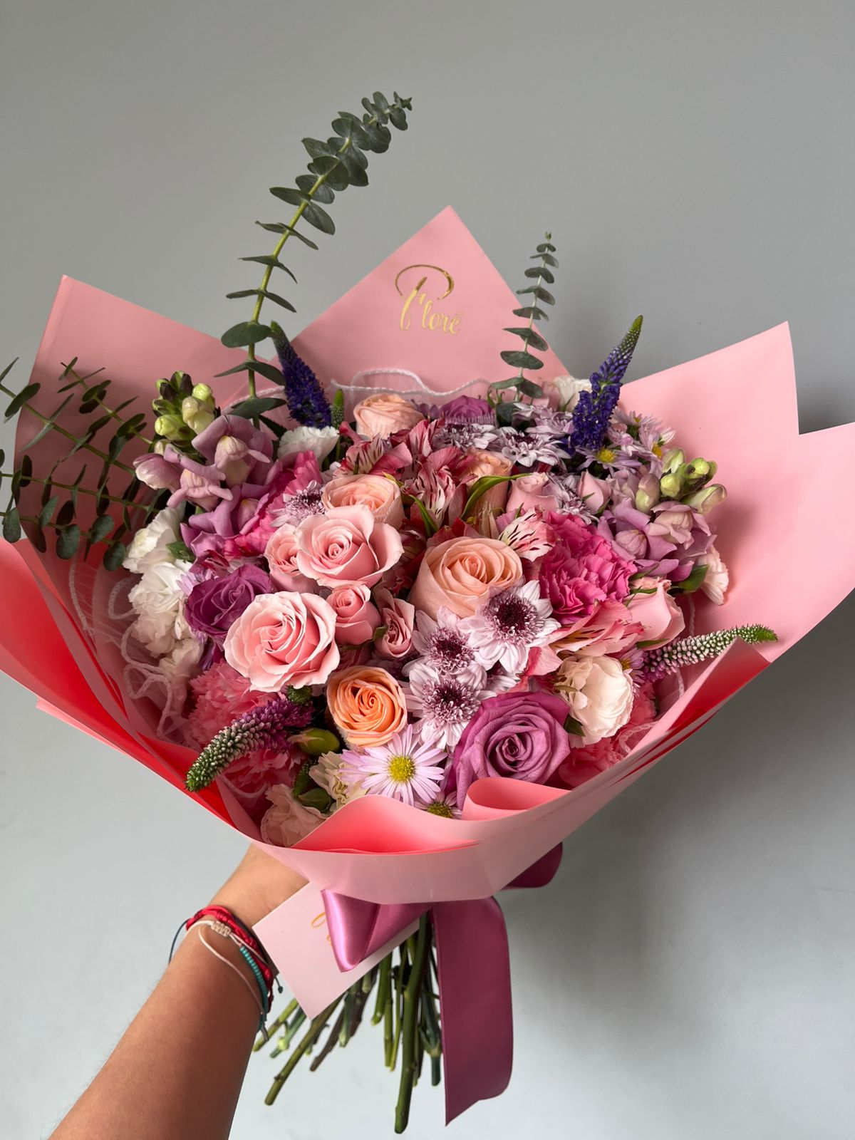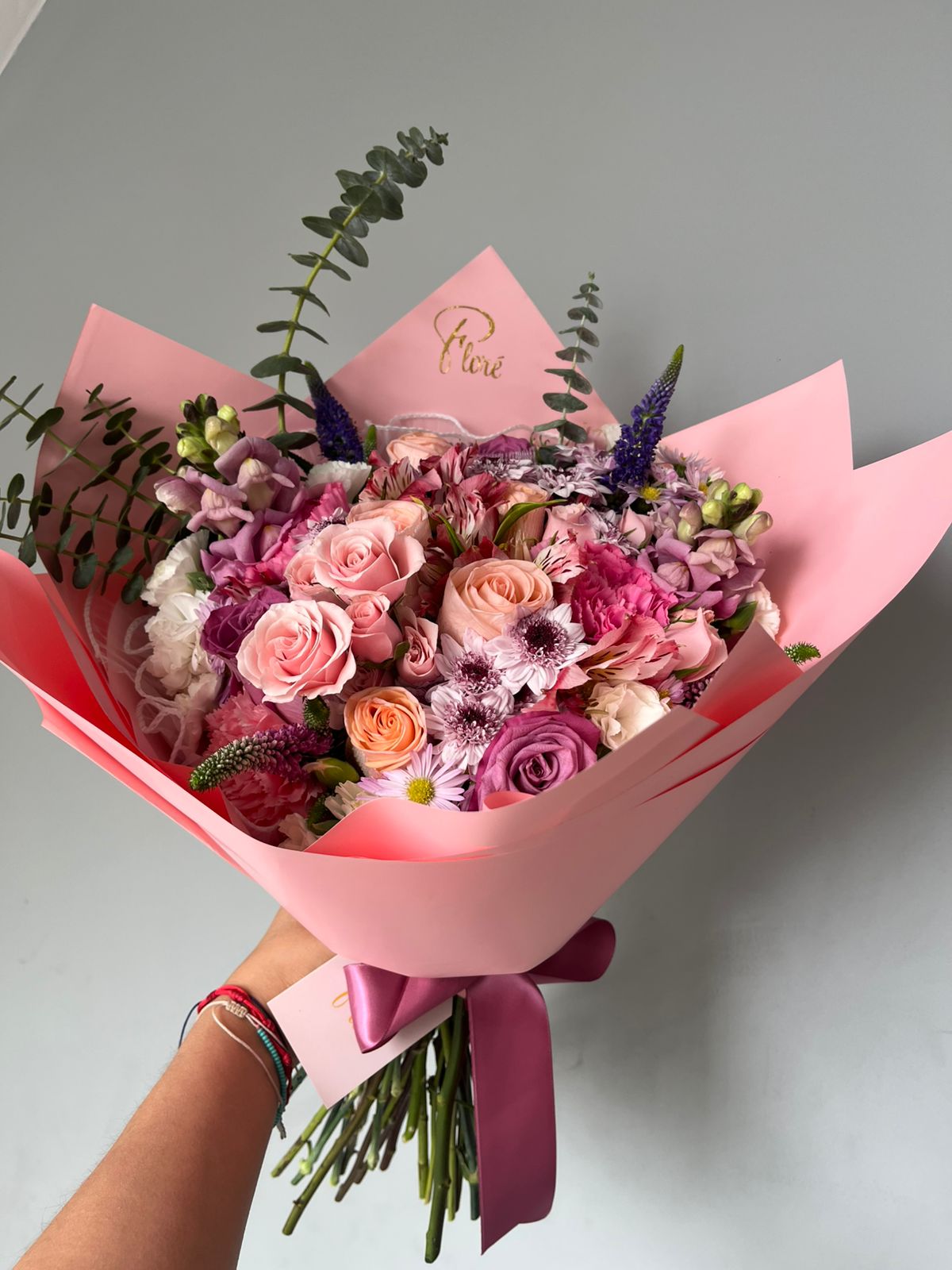 El ramo Eterna Dulzura de Floré es una composición encantadora que combina la ternura del color rosado con la elegancia del lila y la frescura del blanco. Elaborado con rosas 3 rosadas, 3 rosas lilas, mini rosas rosadas s, astromelias, dogo, verónica, claveles rosados y delicados toques de eucalipto, este bouquet transmite romanticismo, gratitud y cariño puro.