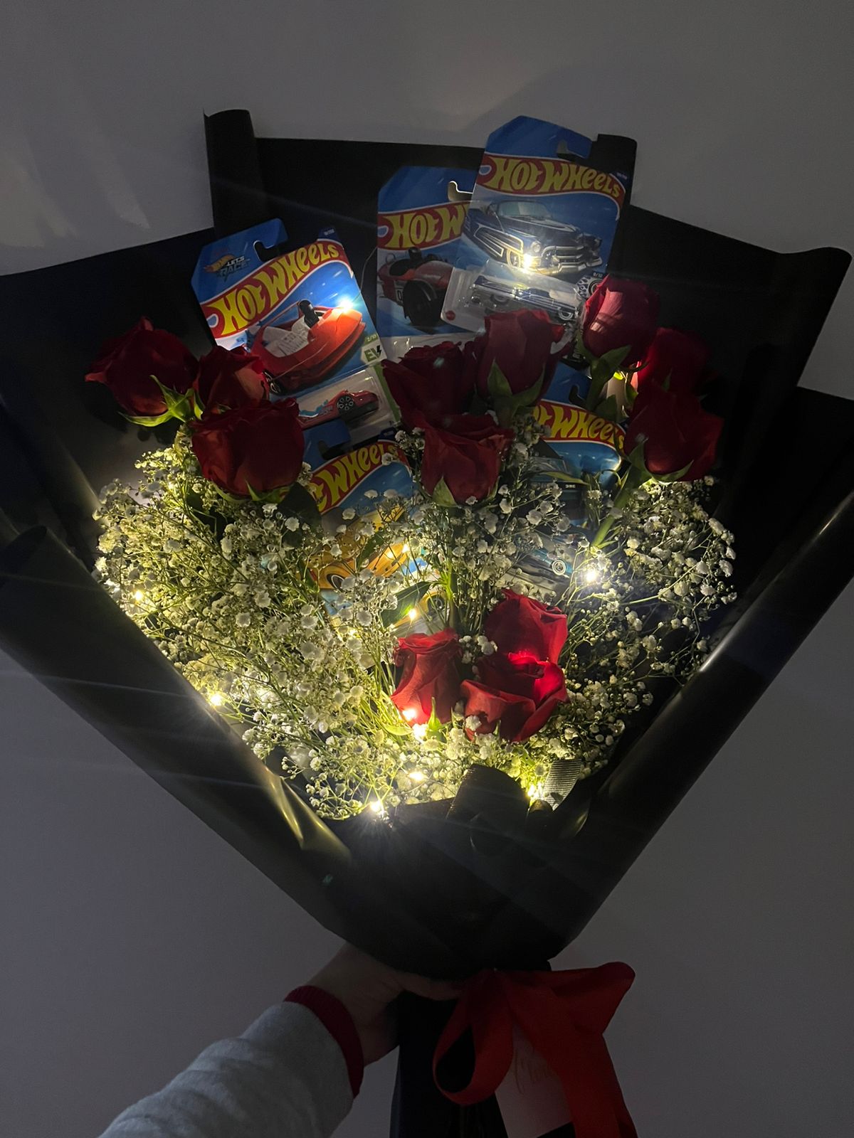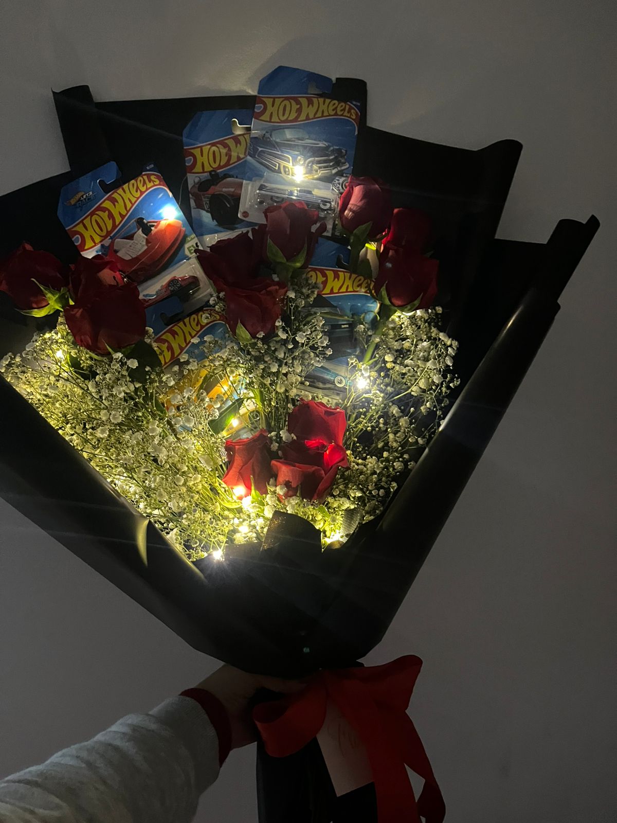 Un detalle lleno de pasión y estilo. Este bouquet combina la elegancia de 12 rosas rojas con la ternura de la gypsophila blanca, envueltos en papel coreano negro para un acabado moderno y sofisticado. Como toque original, incluye autos 5 Hot Wheels coleccionables, perfectos para sorprender con un regalo divertido y diferente.