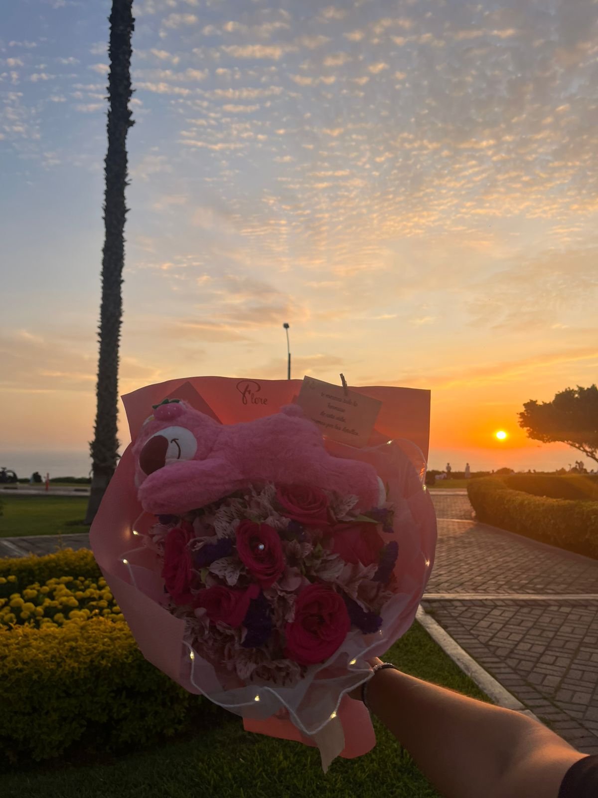 Sorprende a tu persona especial con este encantador ramo que combina rosas fucsias, astromelias y detalles en azul intenso, todo envuelto en tonos rosados que evocan ternura y amor. Incluye el adorable peluche de loto rosa y tul led. Además, una tarjeta personalizable para expresar tus sentimientos más profundos.