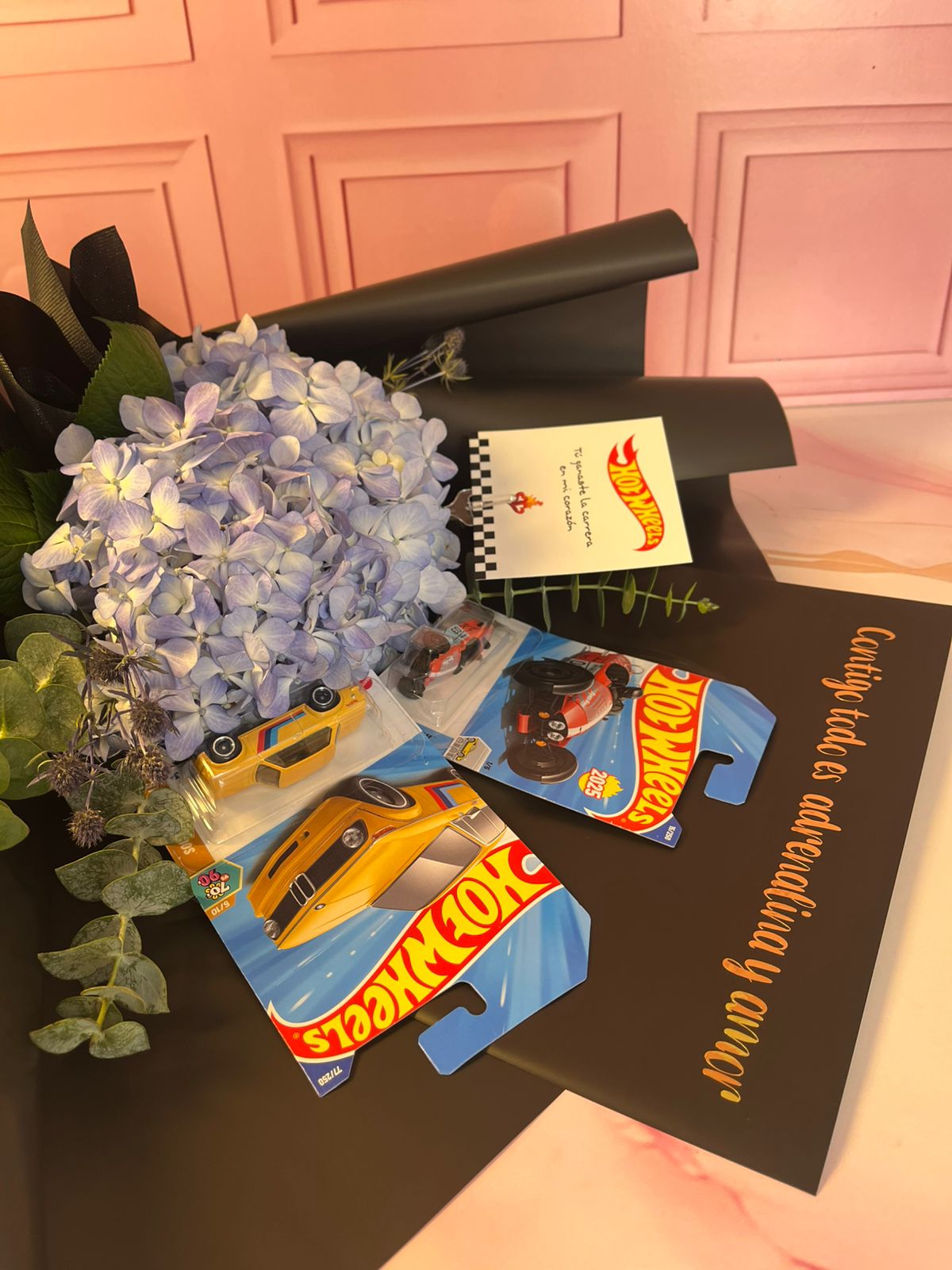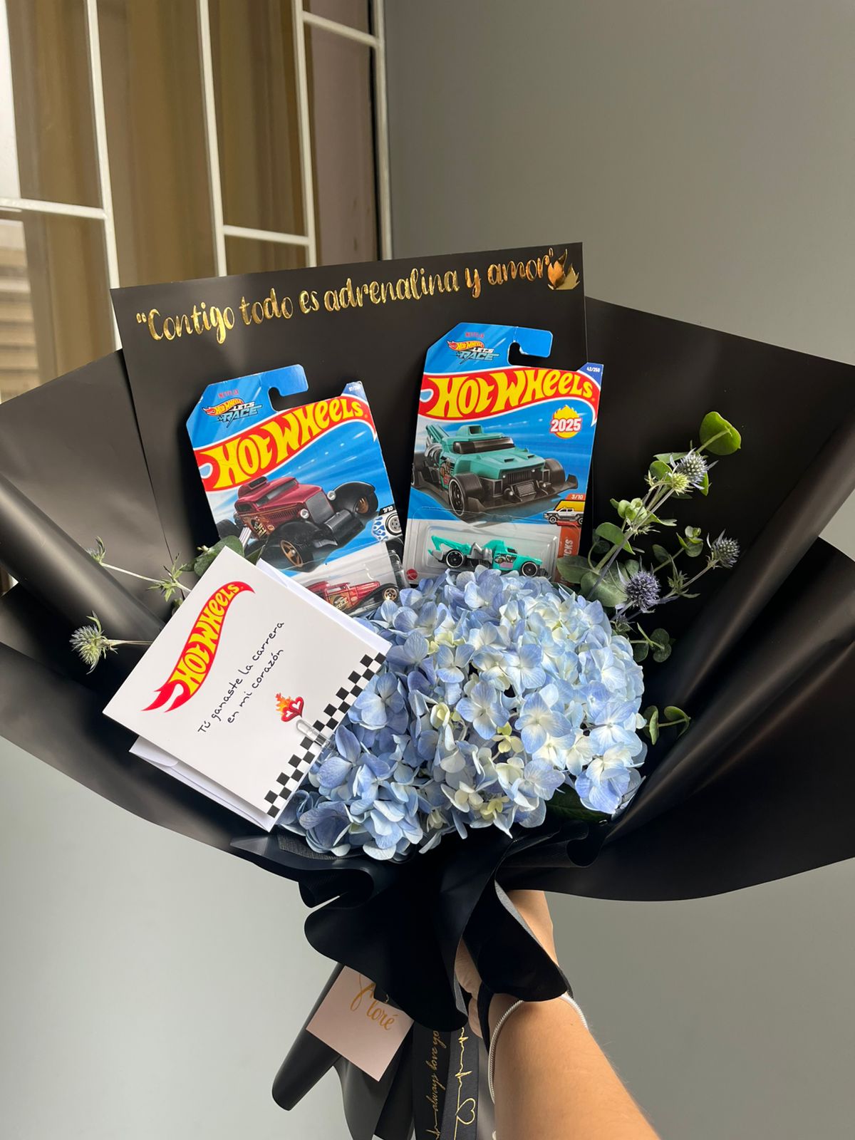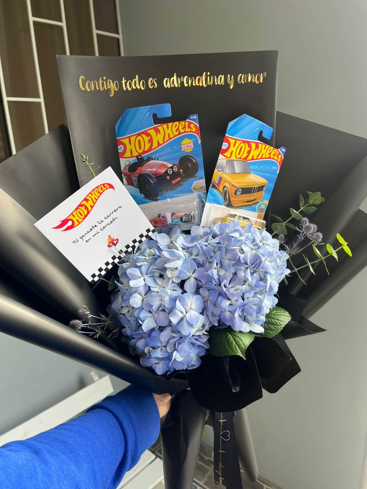 Un detalle único que combina la emoción y la ternura. Este bouquet incluye hortensias azules frescas acompañadas de un elegante follaje, envueltas en papel coreano negro mate, personalizado con la frase: "Contigo todo es adrenalina y amor. Como toque especial, incorpora autos Hot Wheels coleccionables, ideales para sorprender y engreír a quienes disfrutan de la adrenalina y la velocidad.
