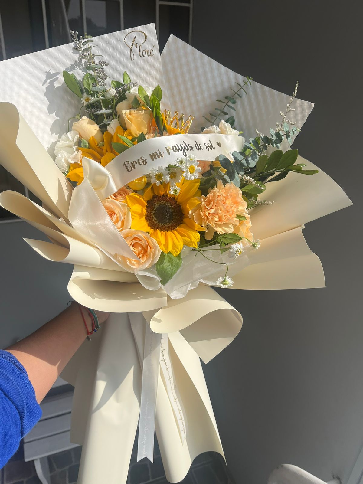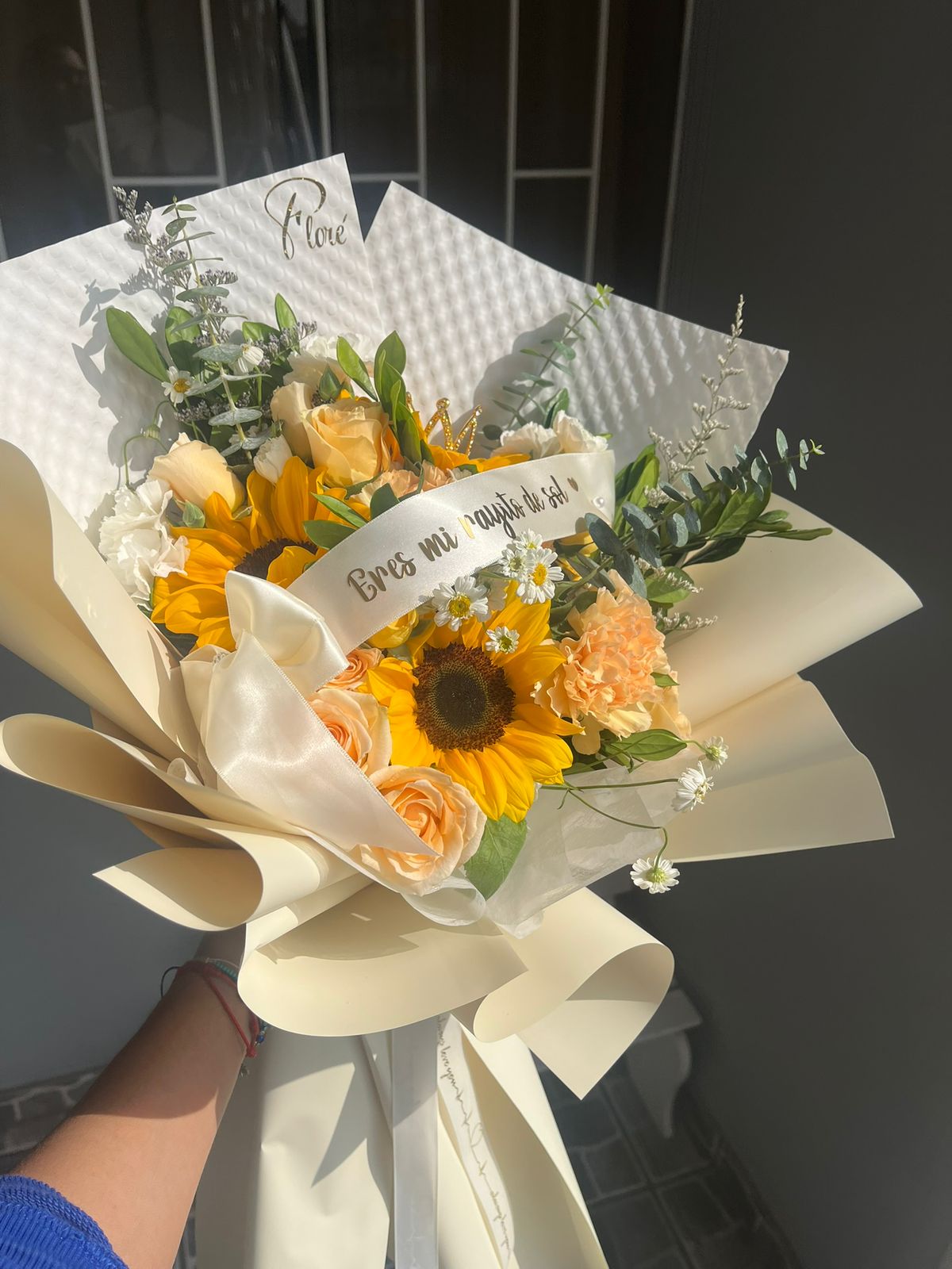 Un bouquet lleno de energía y calidez que ilumina cualquier momento especial. Sus 3 girasoles son el centro de atención, rodeados de delicadas mini rosas en tonos crema y durazno, clavelones importados suaves y margaritas que aportan frescura. Forrado en elegante papel coreano y acompañado de silver dolar que realza su fragancia natural, este ramo transmite alegría, amor y gratitud.