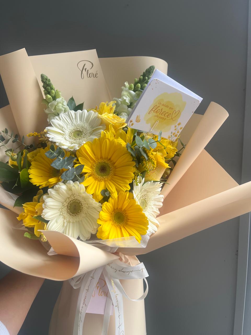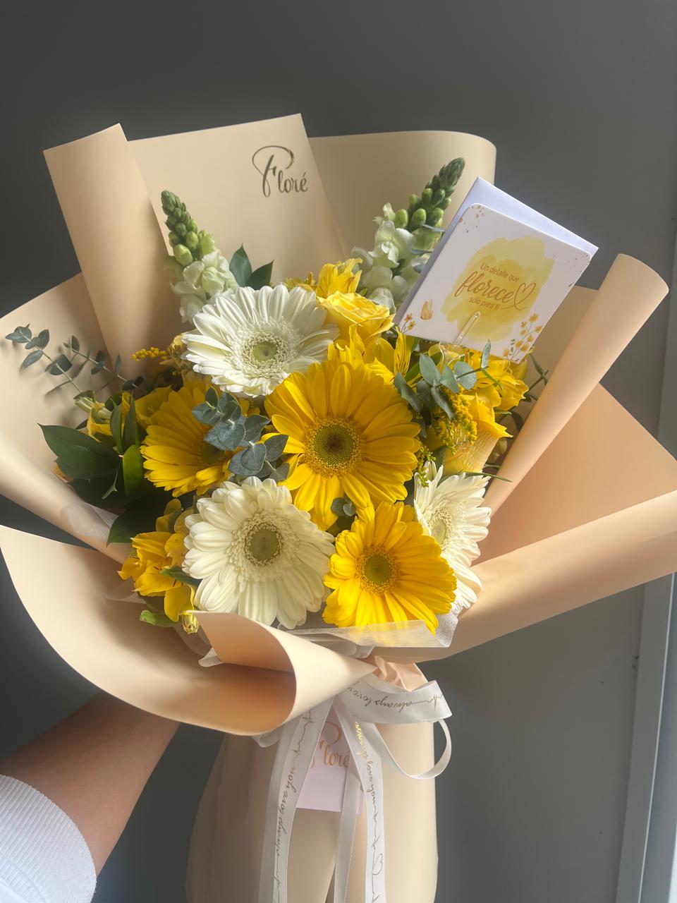 El ramo Rayo de Alegría de Floré está inspirado en la energía del sol y la vitalidad de los nuevos comienzos. Su composición combina 3 gerberas amarillas y 3 blancas, astromelias amarillas, dogo,3 rosas amarillas y un toque de verde eucalipto que equilibra la frescura y la luminosidad del diseño.