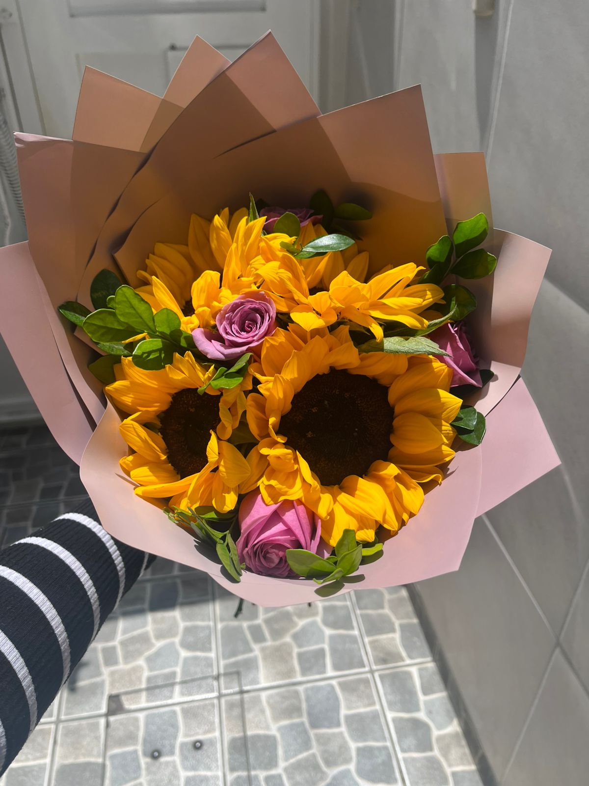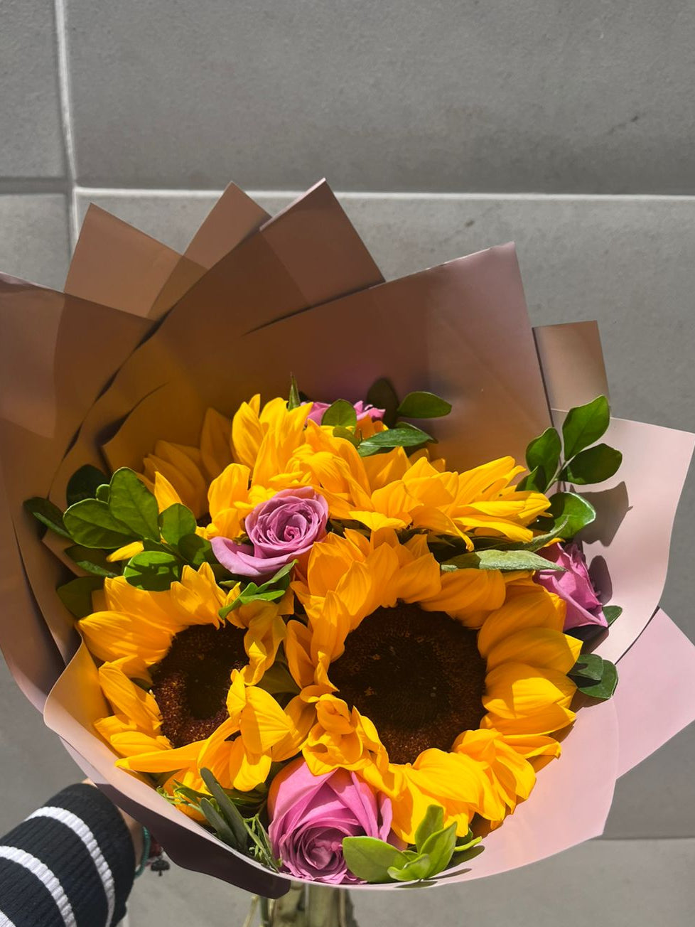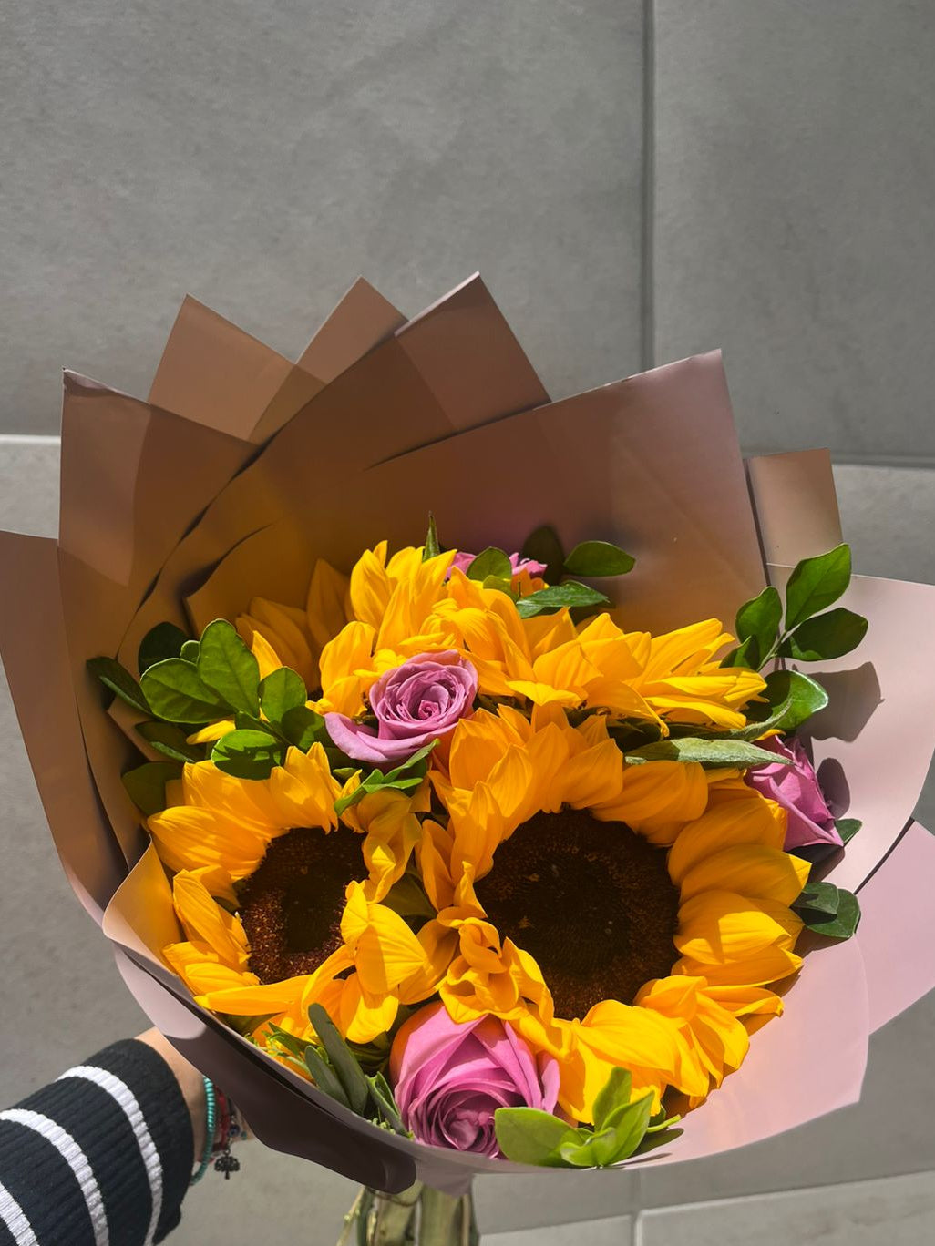 El Sol de Amatista es una fusión perfecta entre energía y dulzura. Sus 4 girasoles radiantes simbolizan alegría, luz y vitalidad, mientras que las 5 rosas lilas aportan un toque romántico y sofisticado. Envuelto en un elegante papel tono lila con detalles verdes naturales, este ramo celebra la armonía entre el brillo del sol y la calma de la serenidad.
