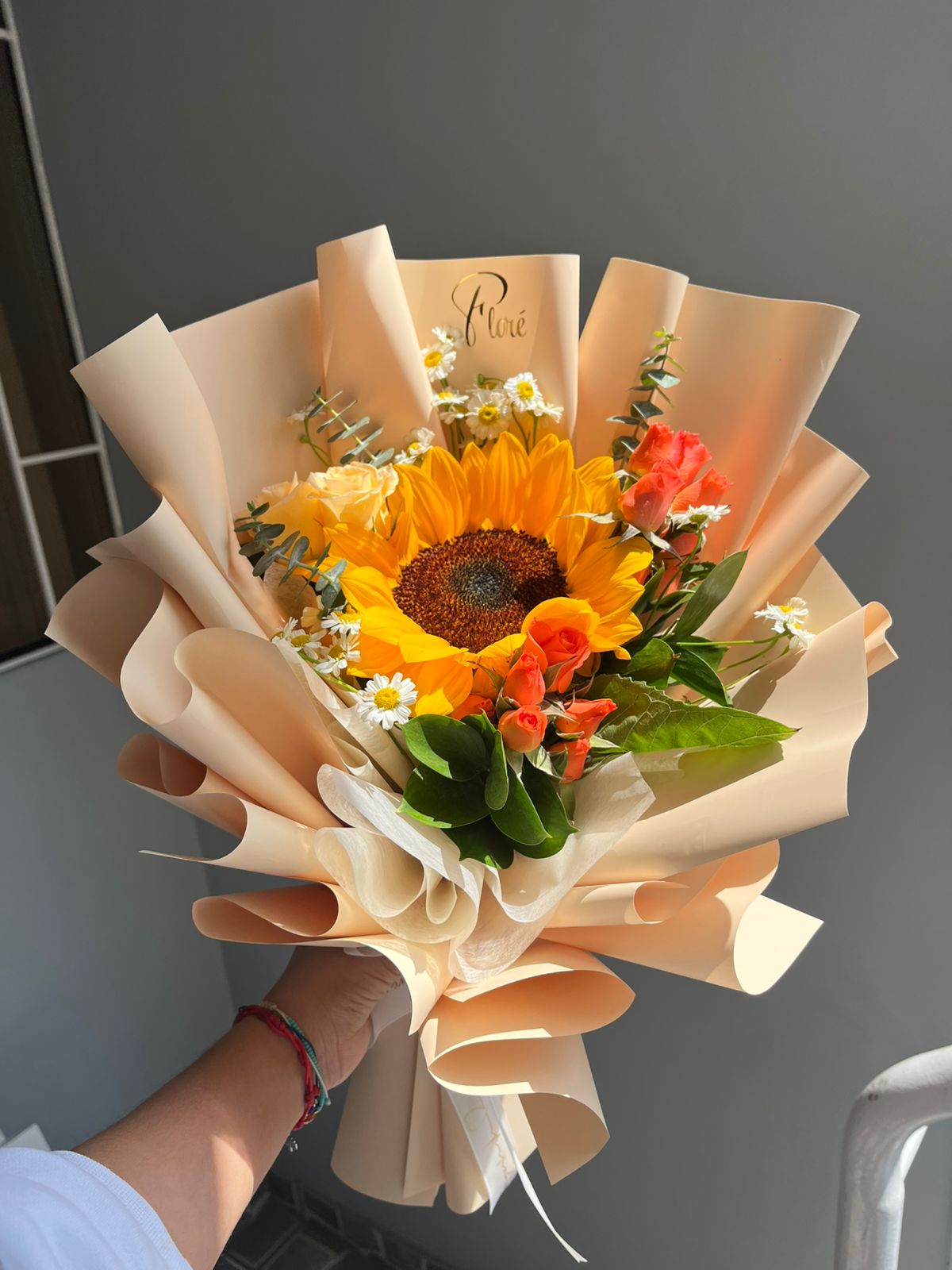 1 girasol central ilumina la composición, acompañado de delicadas mini rosas en tonos durazno y coral, mini margaritas blancas y toques de silver dolar que aportan frescura.
