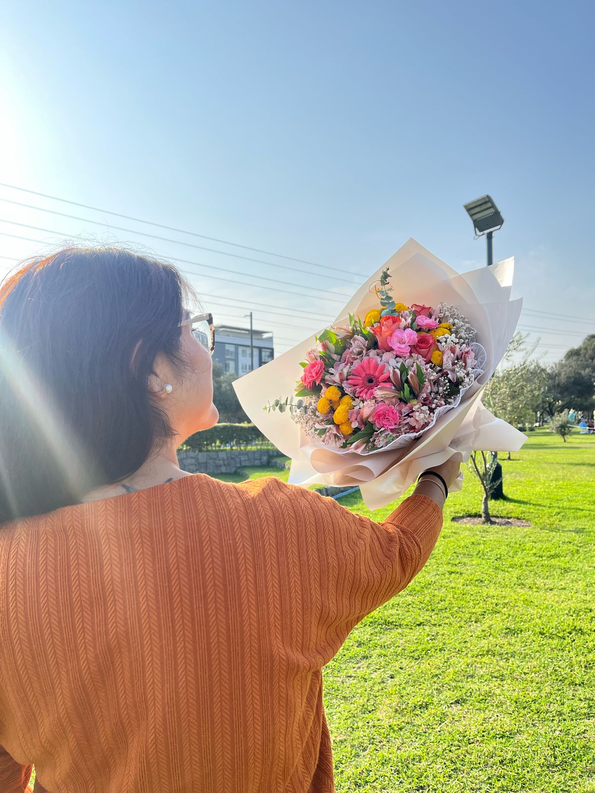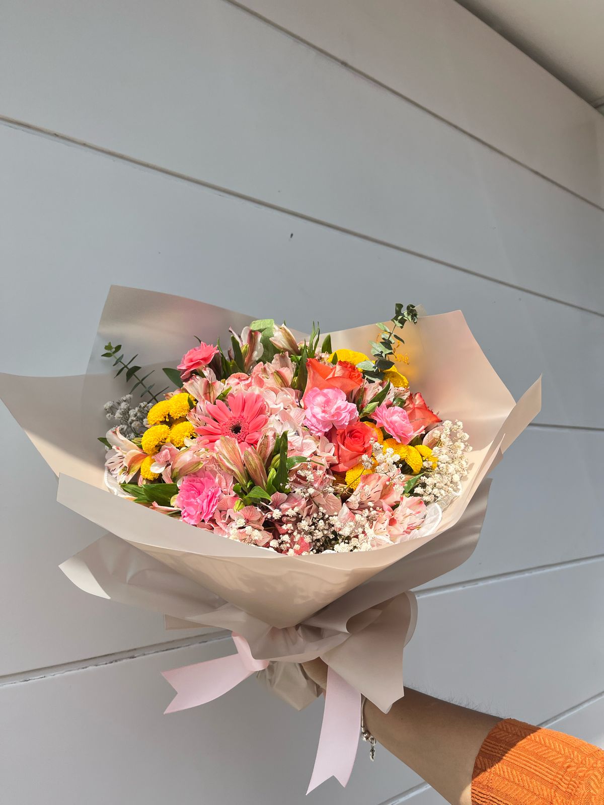 Un homenaje floral para la mujer que ilumina nuestras vidas con su amor incondicional. "Luz de Mamá" es un ramo lleno de alegría y ternura, con suaves tonos rosados, vibrantes amarillos y el encanto delicado del gypsophila, reflejando la dulzura, la fuerza y la calidez que solo una madre puede brindar.